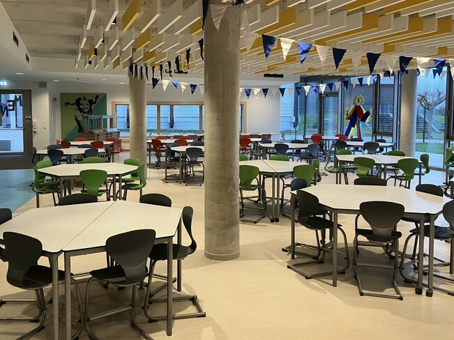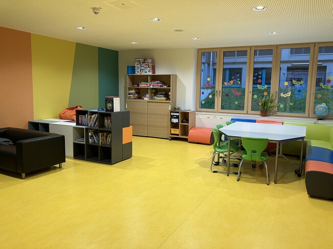 Ein weitläufig angelegter Pausenhof mit Spiel- und Sportgeräten sowie Gras- und Mulchflächen bietet den Kindern viele Möglichkeiten, ihre Pausen aktiv zu gestalten. Während der Pausen ist die Schulbibliothek geöffnet, welche über ein breites Angebot an Lesestoff verfügt.